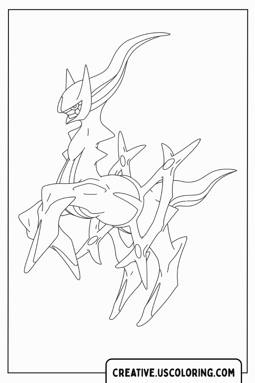 Coloring this complex Legendary Pokémon is an exceptional activity for building fine motor control through carefully tracing the intricate lines of its body, the sharp points of its armor, and the delicate accents. Engaging with this scene encourages imaginative play centered on mythology, cosmic power, and the origin of the world within the Pokémon universe. The detailed structure is perfect for practicing shading and highlighting to convey metallic and divine texture, providing a rewarding artistic endeavor for advanced fans.