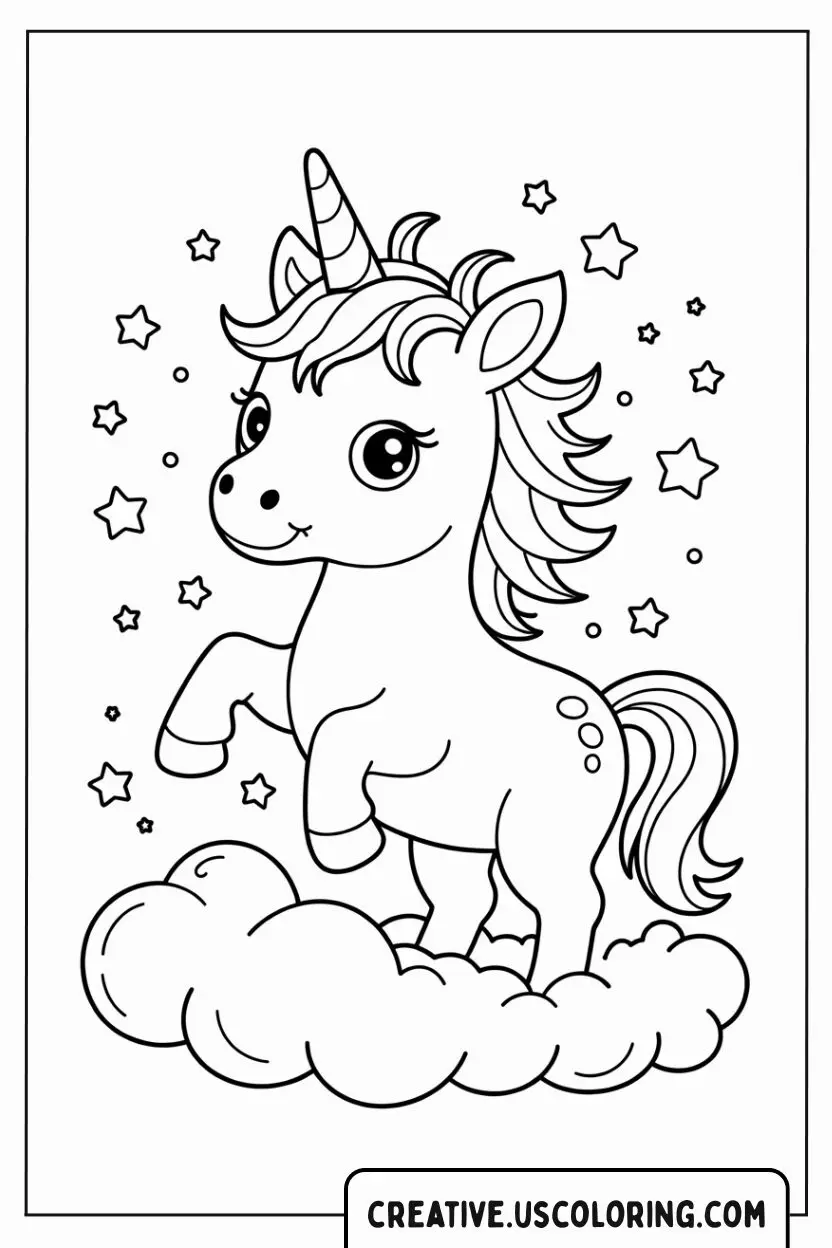 Welcome to a magical world where dreams come alive through color! This Baby Unicorn Coloring Page captures the heartwarming charm of one of the most beloved fantasy creatures ever imagined. Floating gracefully on a soft cloud and surrounded by twinkling stars, the baby unicorn radiates pure innocence and joy. Its curious eyes sparkle with wonder, inviting you to step into a land where anything is possible. This sweet unicorn is a symbol of hope, imagination, and endless possibilities—a perfect escape from the everyday rush of life.