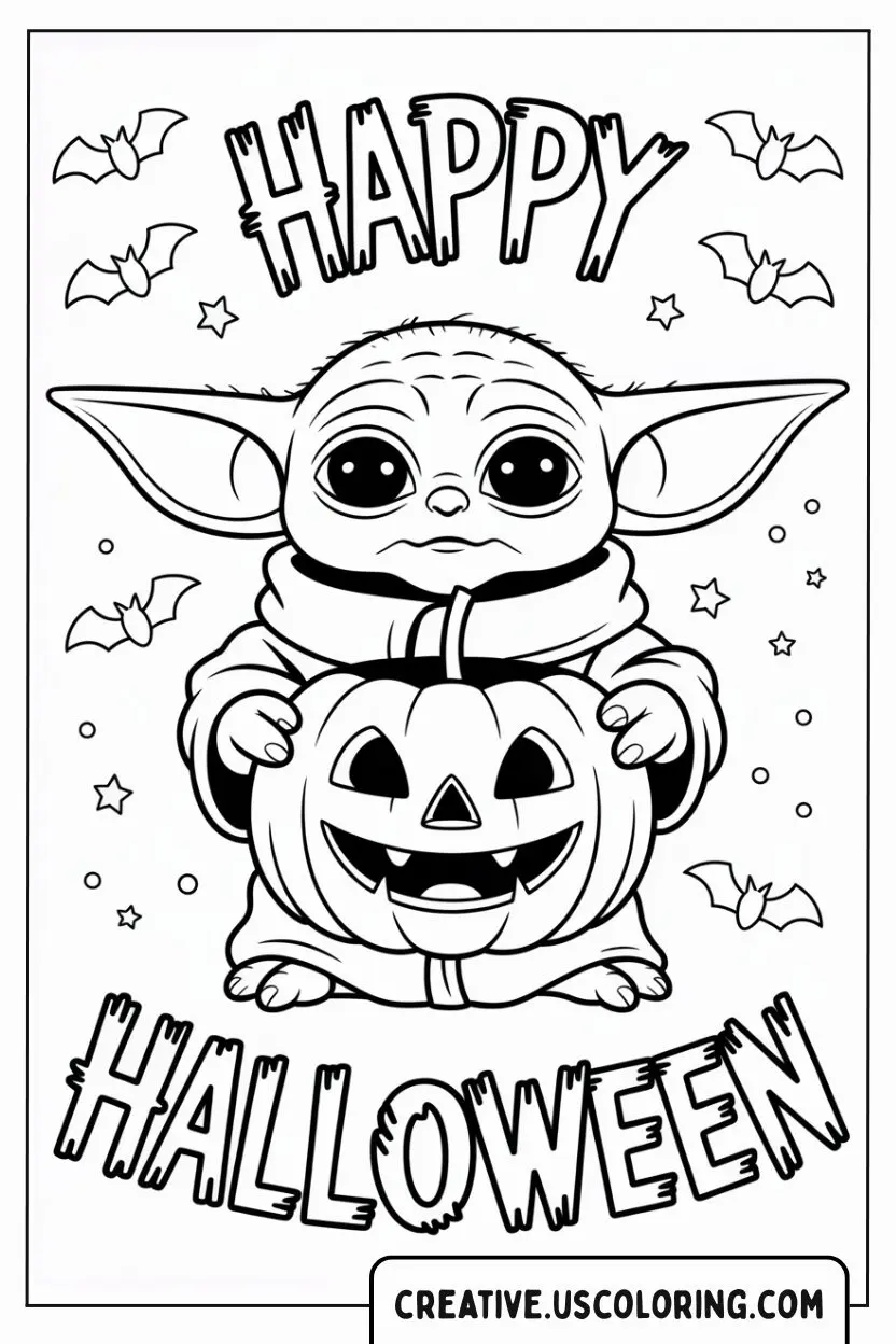 This coloring page captures the adorable little Force-sensitive foundling ready for Halloween. He is cuddled safely in his signature robe, carrying a classic carved Jack-o’-Lantern that perfectly matches his happy, mischievous expression. Surrounded by spooky bats and twinkling stars, Grogu looks like he’s practicing the ancient Jedi tradition of “Trick-or-Treating” across the galaxy. This is a wonderfully cute and simple design that brings together the charming world of The Mandalorian with the festive fun of the holiday.