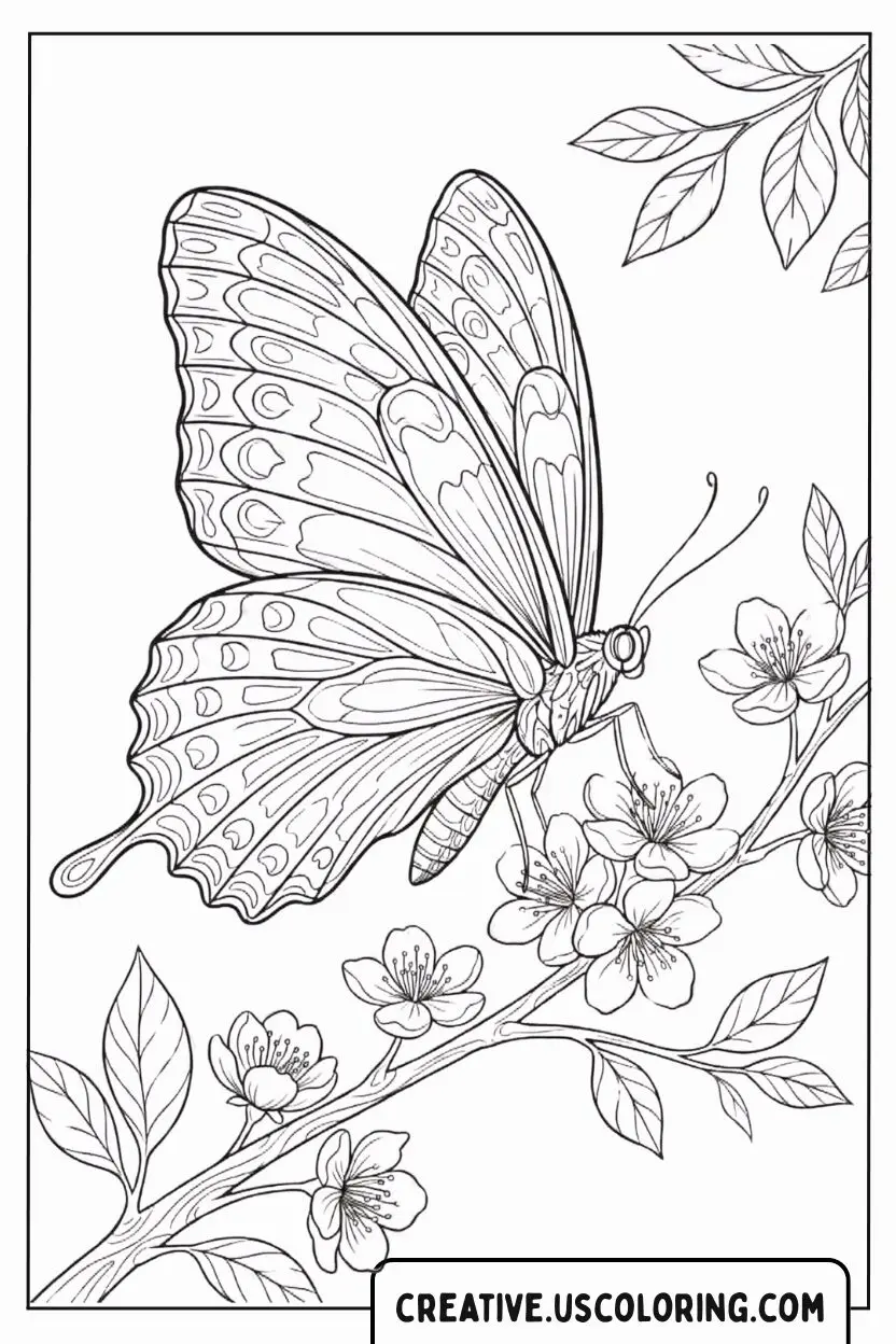 Coloring this highly detailed Butterfly scene is an exceptional activity for boosting concentration and developing advanced shading and blending techniques. The intricate patterns on the wings and the numerous small petals of the flowers require meticulous focus, strengthening fine motor control and precision. Engaging with this subject encourages appreciation for botany, insect anatomy, and the quiet beauty of the seasons. The process provides a highly rewarding, meditative creative challenge, allowing the colorist to capture the exquisite elegance of spring.