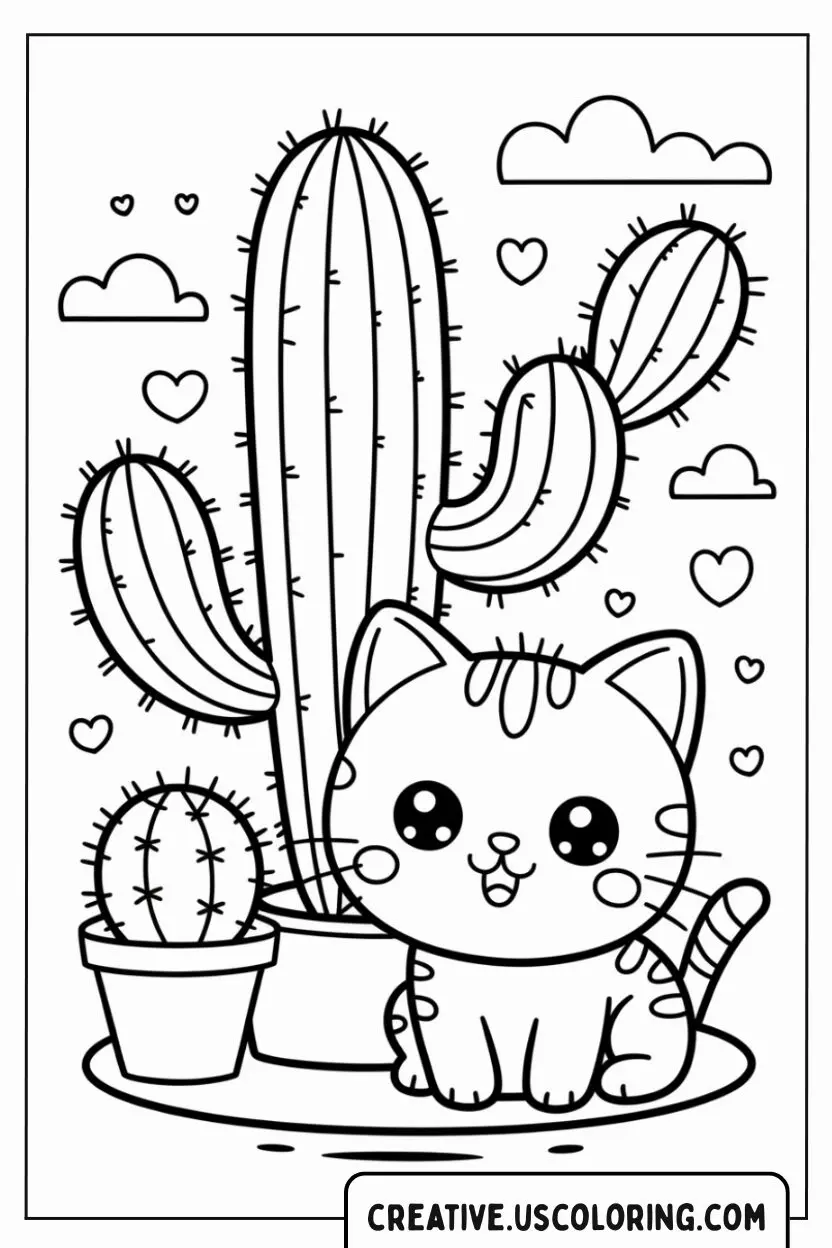 Title cute-cat-sitting-next-to-cactus-coloring-page
