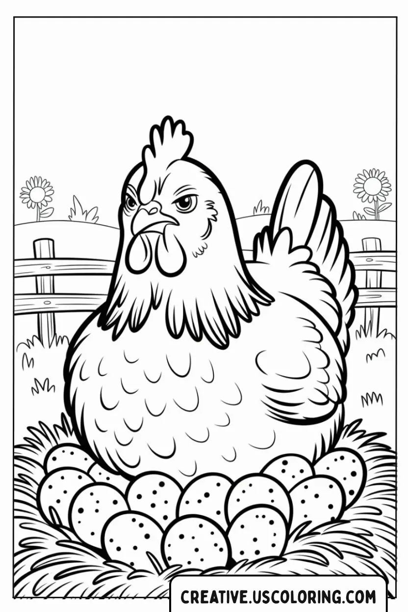 Title hen-sitting-on-nest-of-eggs-coloring-page