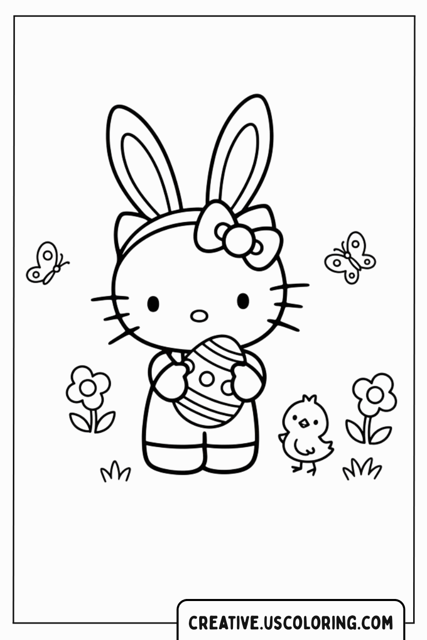 The sweetest helper has arrived for the springtime holiday! This adorable Hello Kitty Easter coloring page features Kitty dressed up with cute bunny ears, holding a beautifully decorated Easter egg, and surrounded by flowers, butterflies, and a fluffy little chick. This image perfectly captures the joy, freshness, and fun of spring and the Easter holiday. It’s a gentle scene that reminds us of springtime beauty, the sweetness of new life, and the excitement of the annual egg hunt. It’s an open invitation to fill this charming garden moment with bright, cheerful, springtime colors.
