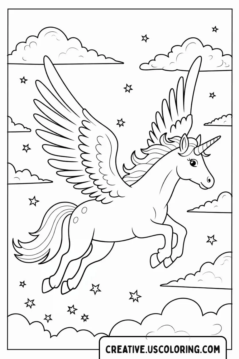 Let your imagination take off with our Flying Unicorn Coloring Page! 🦄💫 Soaring gracefully through fluffy clouds and sparkling stars, this majestic unicorn invites you to join a sky full of dreams and color. With its powerful wings stretched wide and its mane flowing in the wind, this magical creature represents freedom, wonder, and endless creativity.