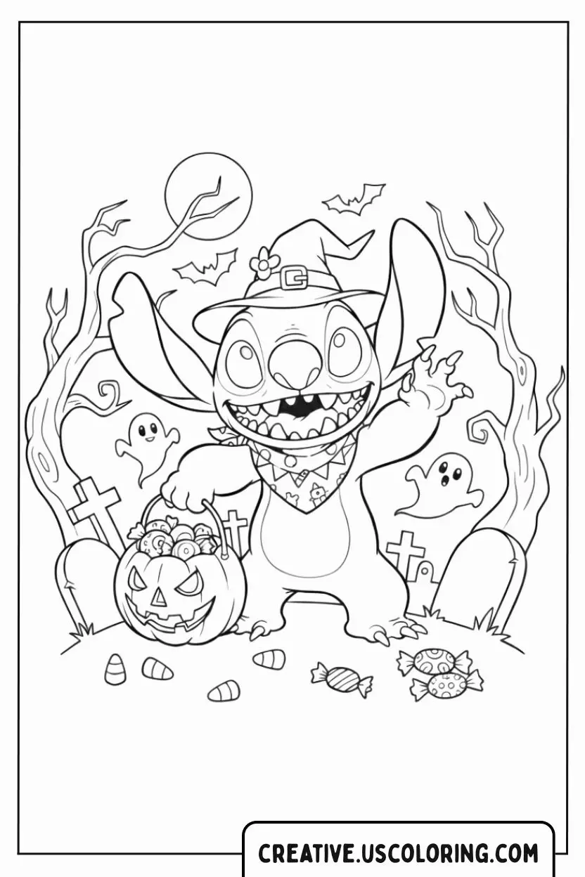 Get ready for an extra mischievous Halloween adventure! This exciting Halloween Stitch coloring page features Experiment 626 dressed up in a cute witch’s hat and bandana, happily gathering candy in a graveyard. He’s surrounded by spooky bare trees, friendly ghosts, tombstones, and a grinning full moon. This complex image perfectly blends the chaotic fun of Stitch with the adventurous spirit of Halloween night. It’s an open invitation to fill this detailed, eerie, and playful scene with vibrant, spooky colors!