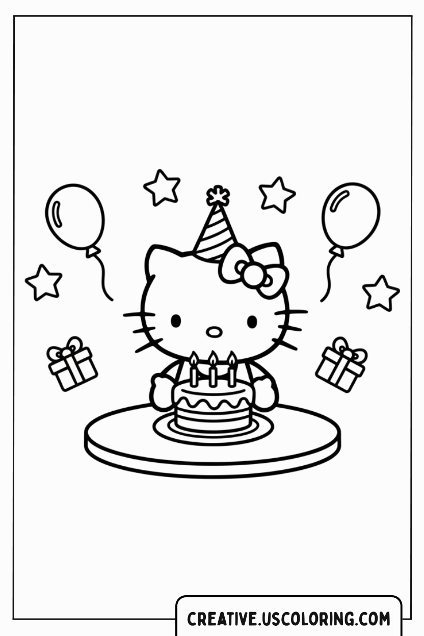 To color this celebration, use the brightest, most festive colors you can find! Hello Kitty should be colored white, with her signature bow often being red or pink. Her party hat can be colored in fun stripes of red and blue or yellow and green. The birthday cake can be colored with layers of different flavored frosting—try pink, white, and brown. The little gifts can be wrapped in bright, bold colors with contrasting bows. The balloons and stars should be colored in alternating, cheerful shades like yellow, blue, and pink to make the entire scene pop with celebratory energy.
