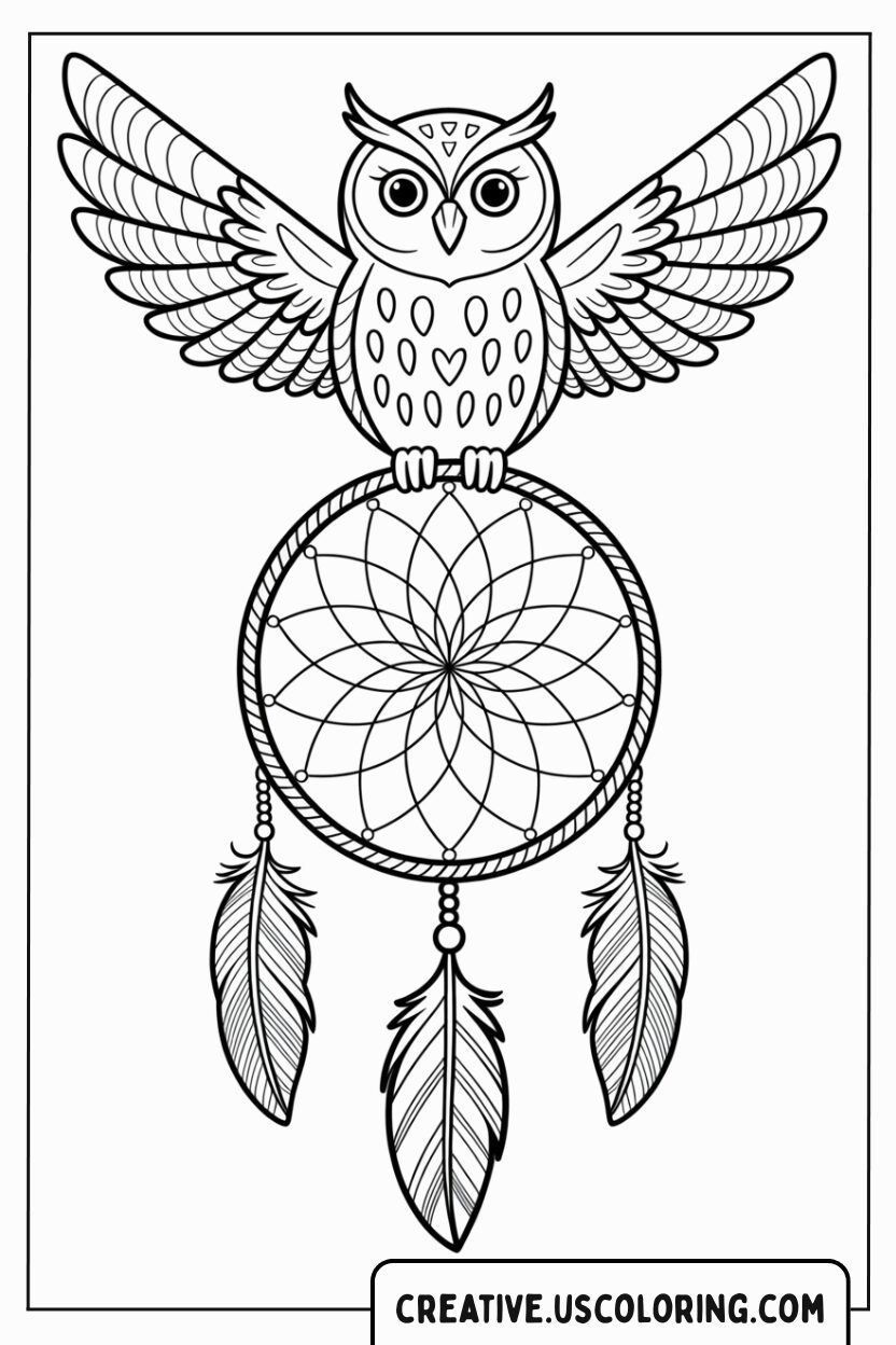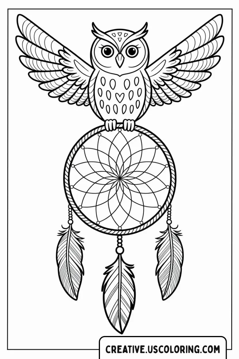 To capture the mystical energy of this design, try combining rich earth tones — such as browns, golds, and warm grays — for the owl, with turquoise, teal, and crimson for the dreamcatcher details. Add silver or bronze highlights to create a metallic shimmer effect. For the feathers, try gradient shading from deep purple to sky blue for a magical touch.
