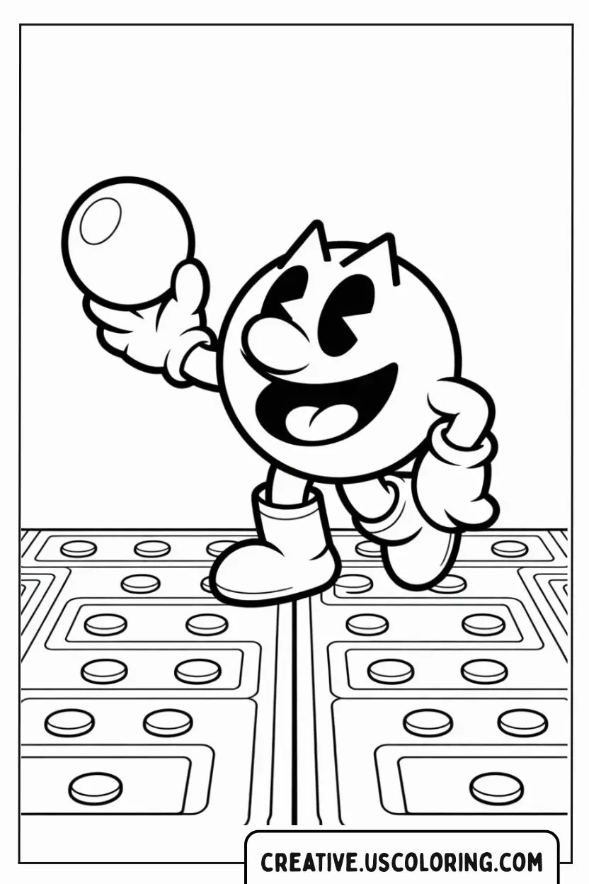 The ball he holds could represent a Power Pellet (which lets him eat the ghosts) or perhaps the Boss Galaxian bonus fruit (which awards massive points). The tiled floor hints at the endless levels of the classic arcade challenge. This lively coloring page celebrates Pac-Man’s energetic personality and the sheer fun of retro video gaming.
