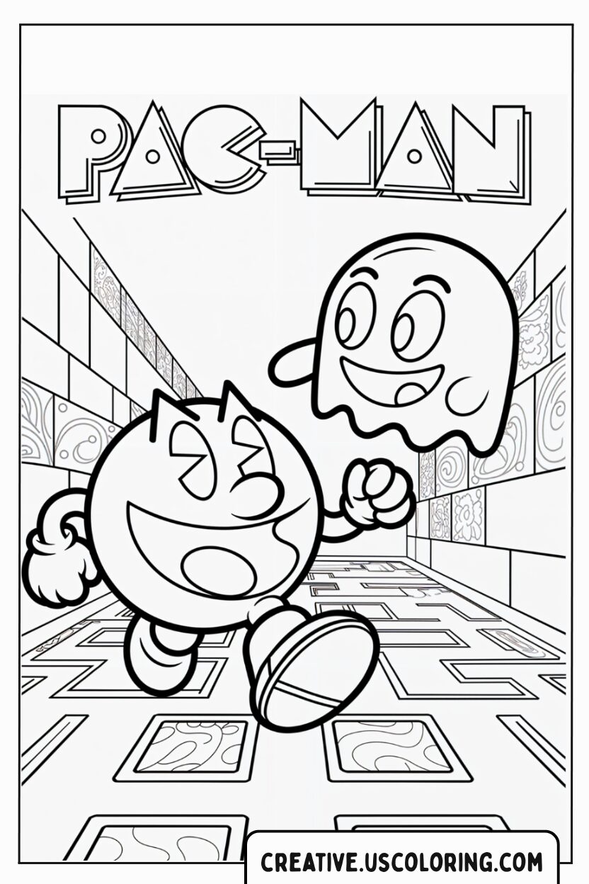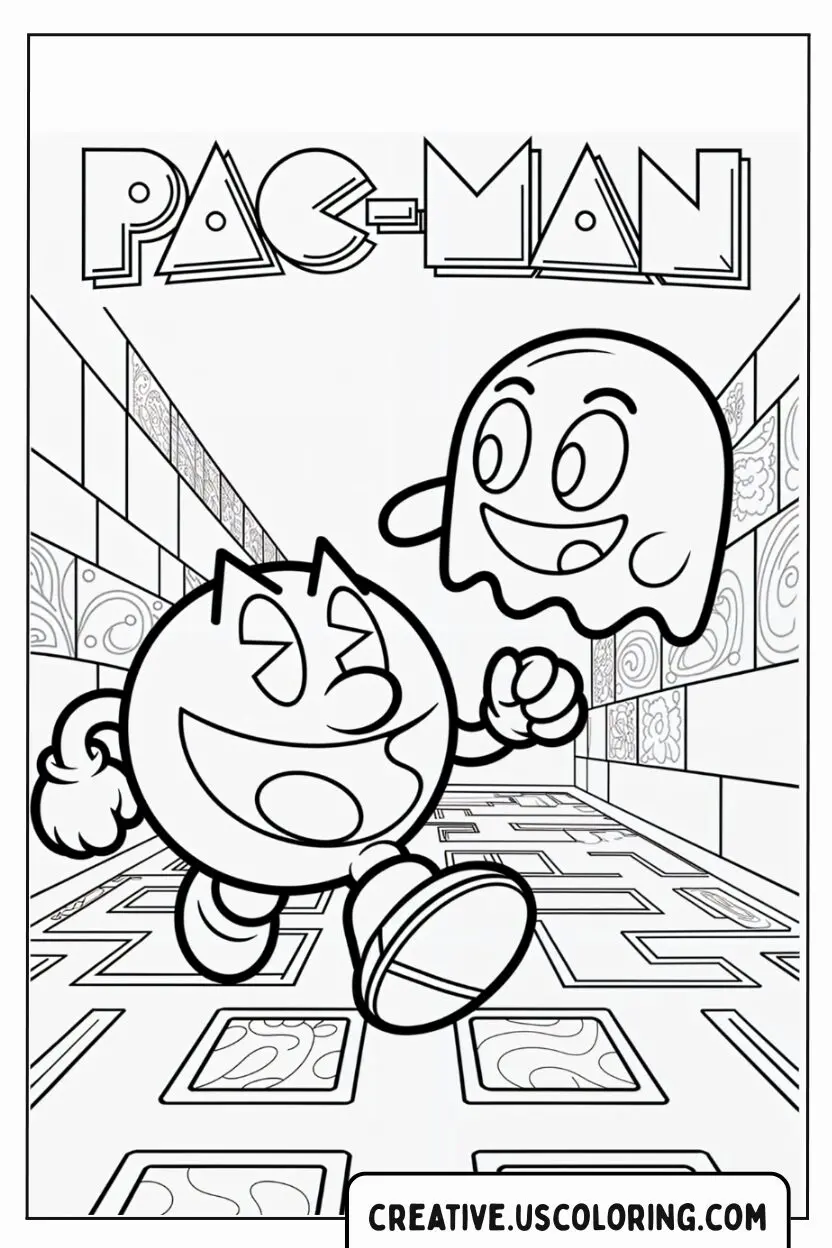 This scene is styled after a modern or retro 3D reboot of the classic arcade game, where the walls are tiled and the maze stretches into the background. The detailed patterns on the walls, floor, and even the “PAC-MAN” logo above create visual complexity, reflecting the endless levels and the addictive, focused nature of the game. For adult colorists, this page is a fantastic exercise in perspective and texture, transforming a simple arcade concept into a complex, satisfying artistic challenge.