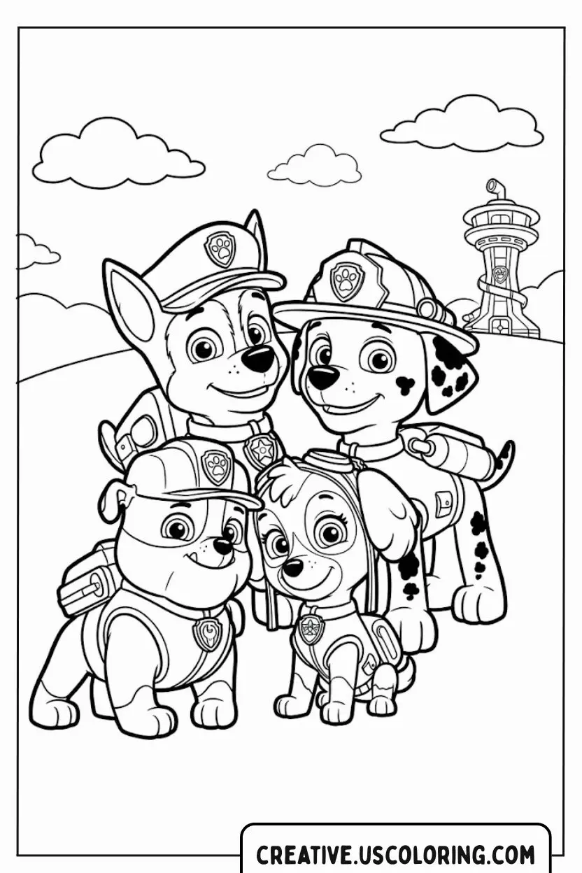 This heartwarming illustration captures four core members of the Paw Patrol—Chase (Police Pup), Marshall (Fire Pup), Rubble (Construction Pup), and Skye (Aviator Pup)—standing close together on a grassy hill with the Paw Patrol tower visible in the distance! This image highlights the strong bond of friendship, loyalty, and teamwork that makes the Paw Patrol unstoppable in Adventure Bay. Their story is about their commitment to their motto, “No job is too big, no pup is too small!”, and the comfort they find in their pack. Coloring this scene invites you to use their signature bold uniform colors and bring this heroic, loyal team to vibrant life!