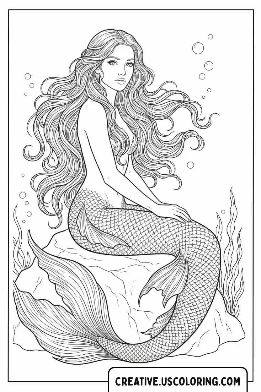 Coloring this highly detailed, realistic Mermaid page is an outstanding activity for both advanced colorists and serious beginners looking to improve their skills. It provides an excellent platform for practicing advanced color blending, shading (chiaroscuro), and creating realistic textures on the skin, hair, and scales. Engaging with this subject promotes mindfulness and focus by requiring precision, while fostering a deep appreciation for the artistry involved in capturing realistic beauty within a fantasy setting. The finished piece is a testament to patience and technical skill.