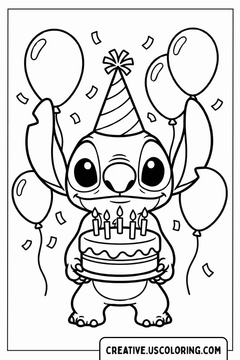 To color Stitch and his party scene, use bright, bold, and festive colors. Stitch’s fur should be his signature cobalt blue or light blue. The party hat should be striped with bright, contrasting colors like red, yellow, and green. The cake can be white or pale yellow with vibrant frosting in pink or blue, and the candles should have bright yellow flames. The balloons and confetti should be colored in a mix of primary colors (red, blue, yellow) to create a lively, celebratory atmosphere.